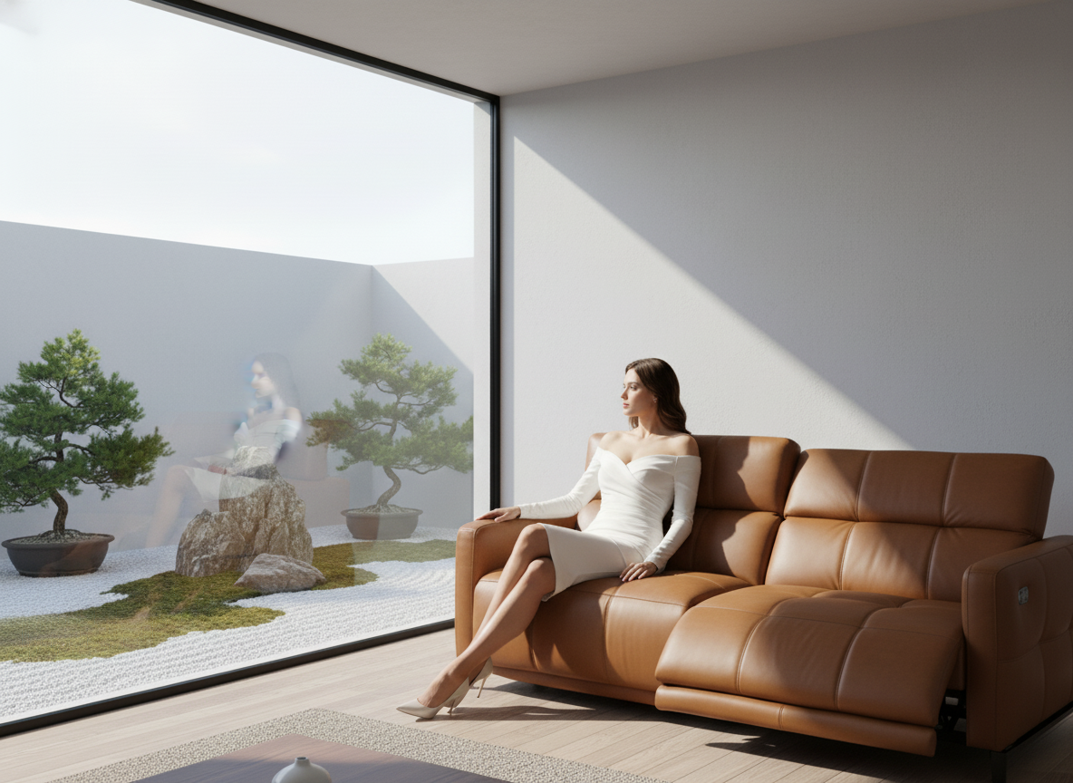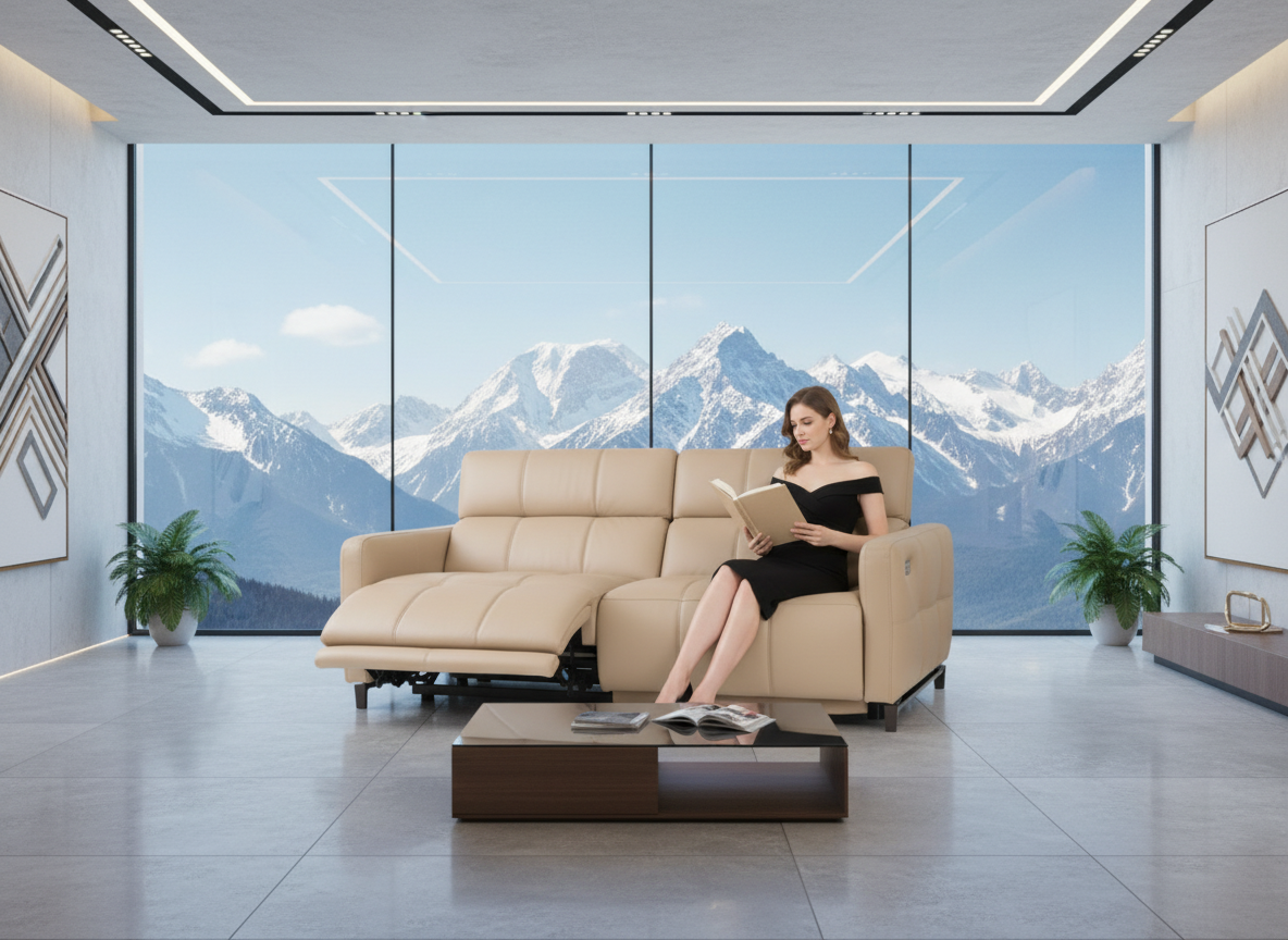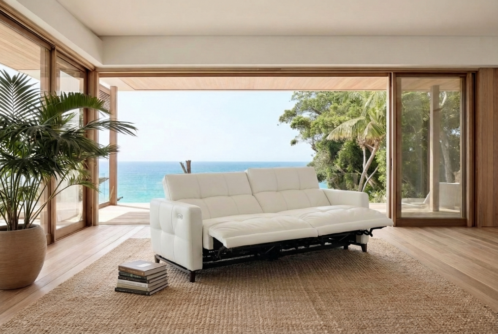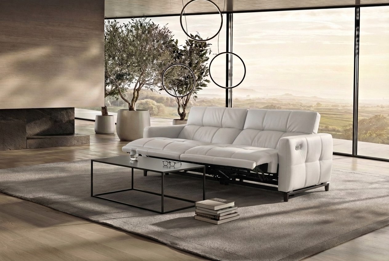 The Cube motorized sofa combines traditional form with high-fashion details, creating a visually striking and comfortable seating experience. Its orthogonal, orderly texture, highlighted by intricate stitching, contrasts with the precisely contoured seat shape and concealed mechanisms. This sofa offers supple comfort and transforms effortlessly into a recliner, with individually adjustable backrests and seat depth to suit personal preferences.